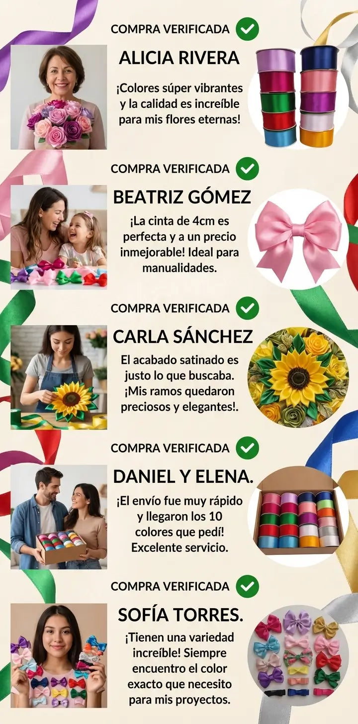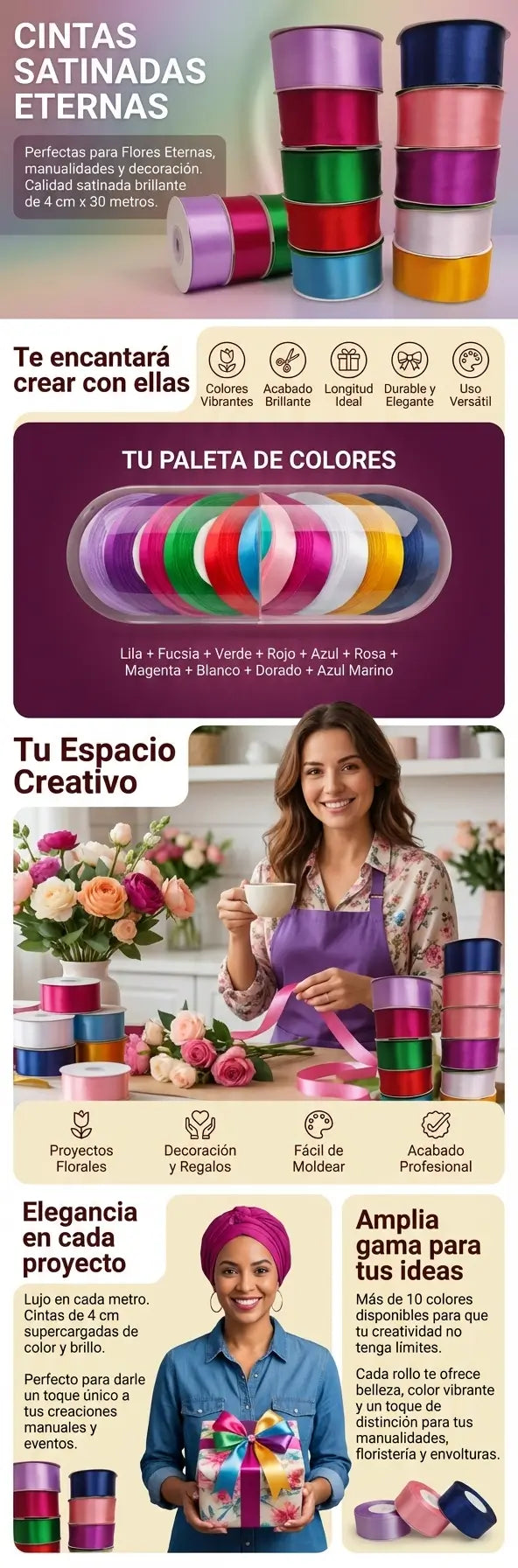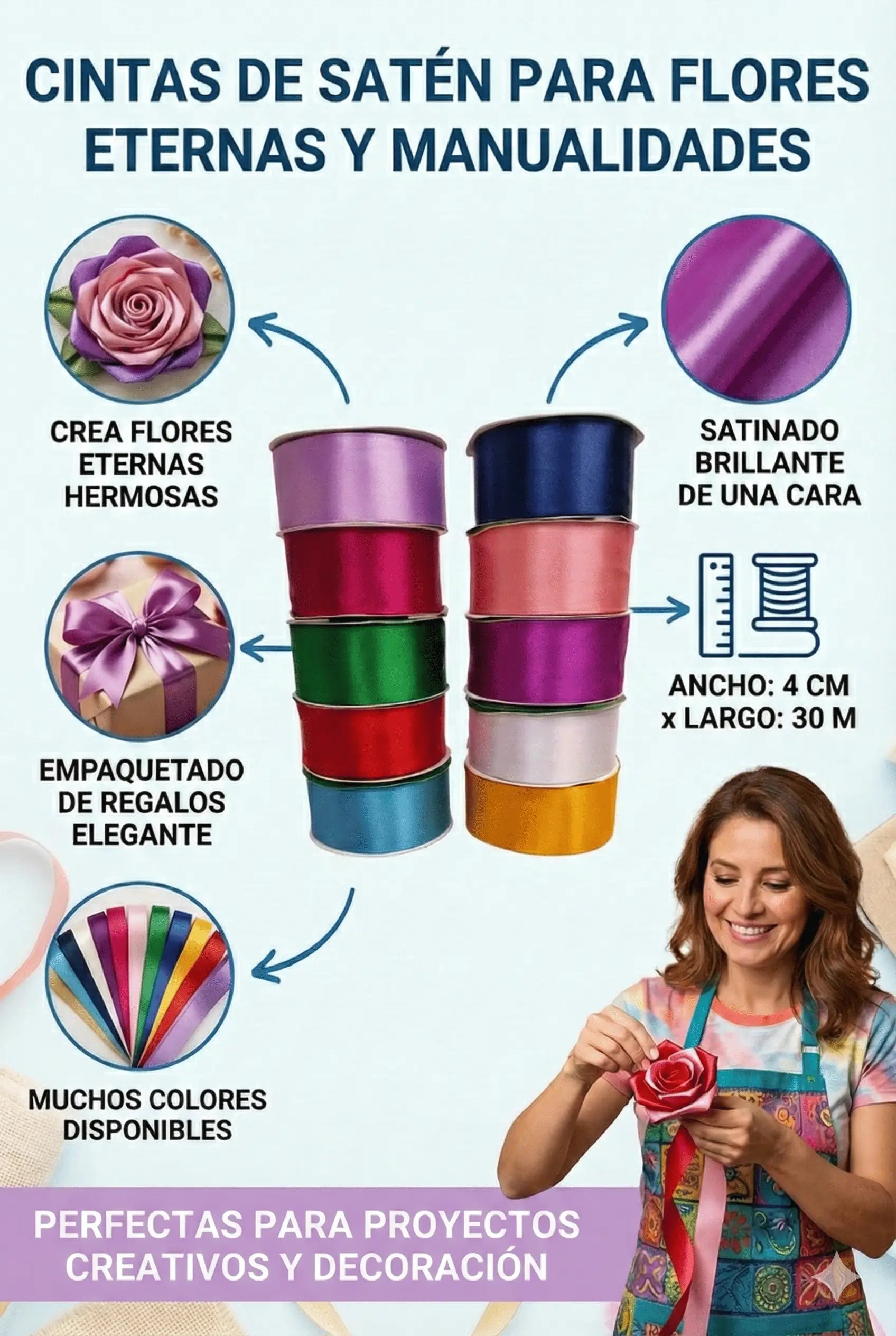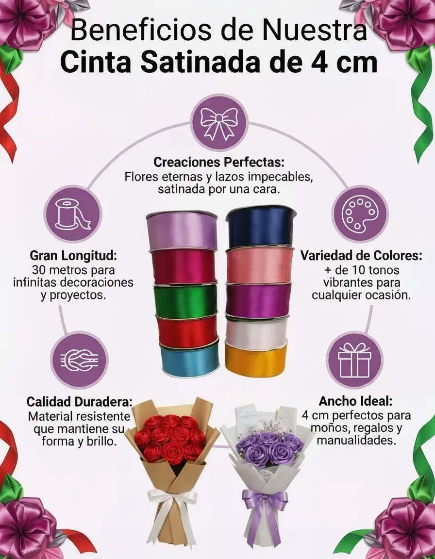 Tu compra incluye 6, 9 o 12 rollos de cinta satinada de 4cm x 30 metros, en los colores que seleccionaste.