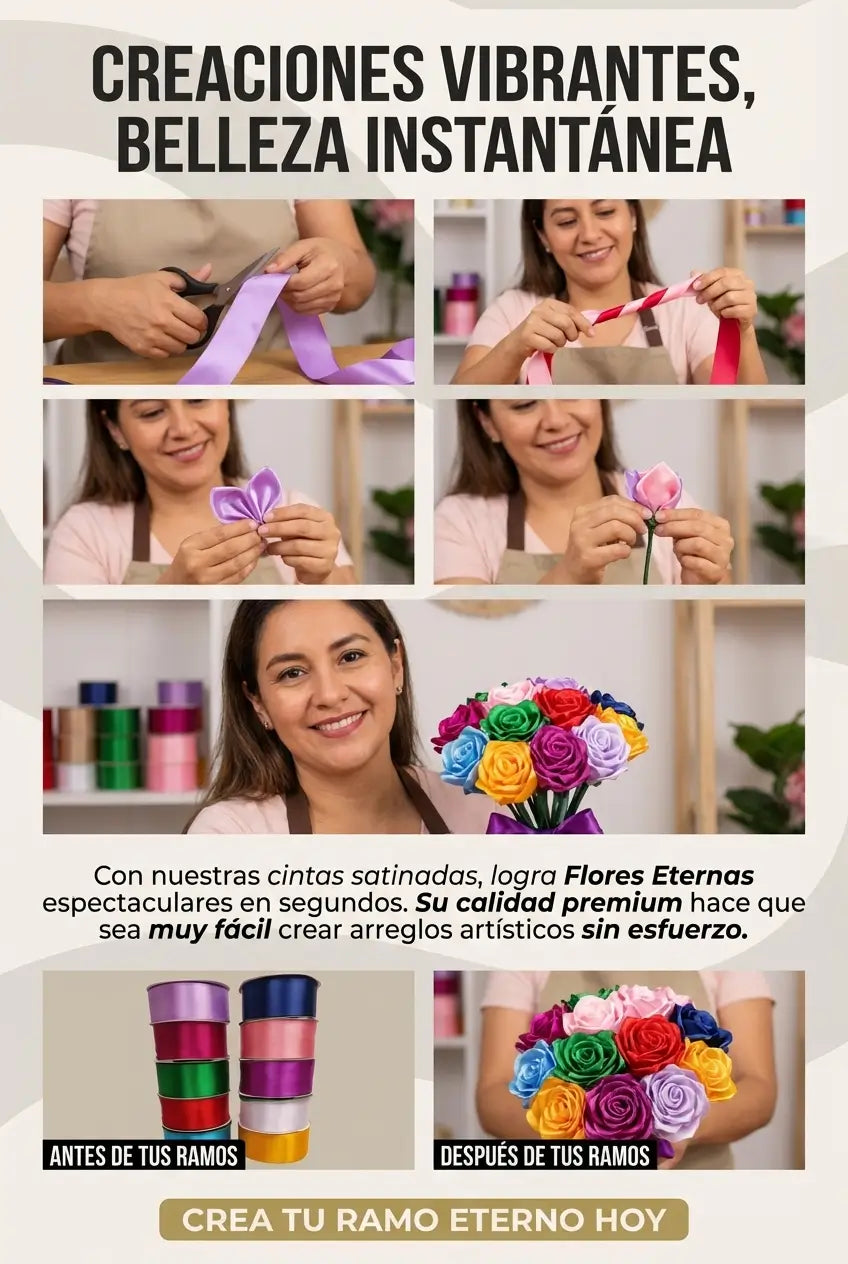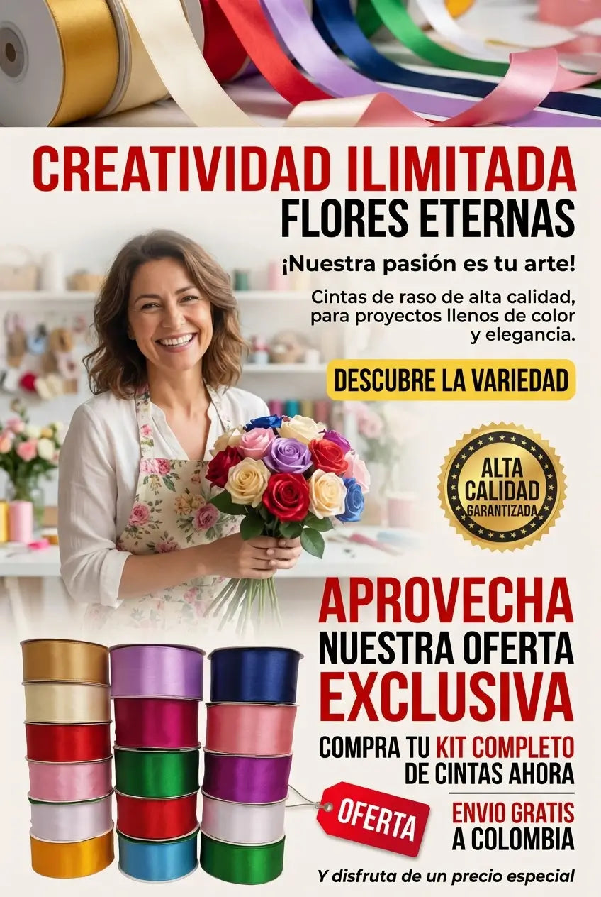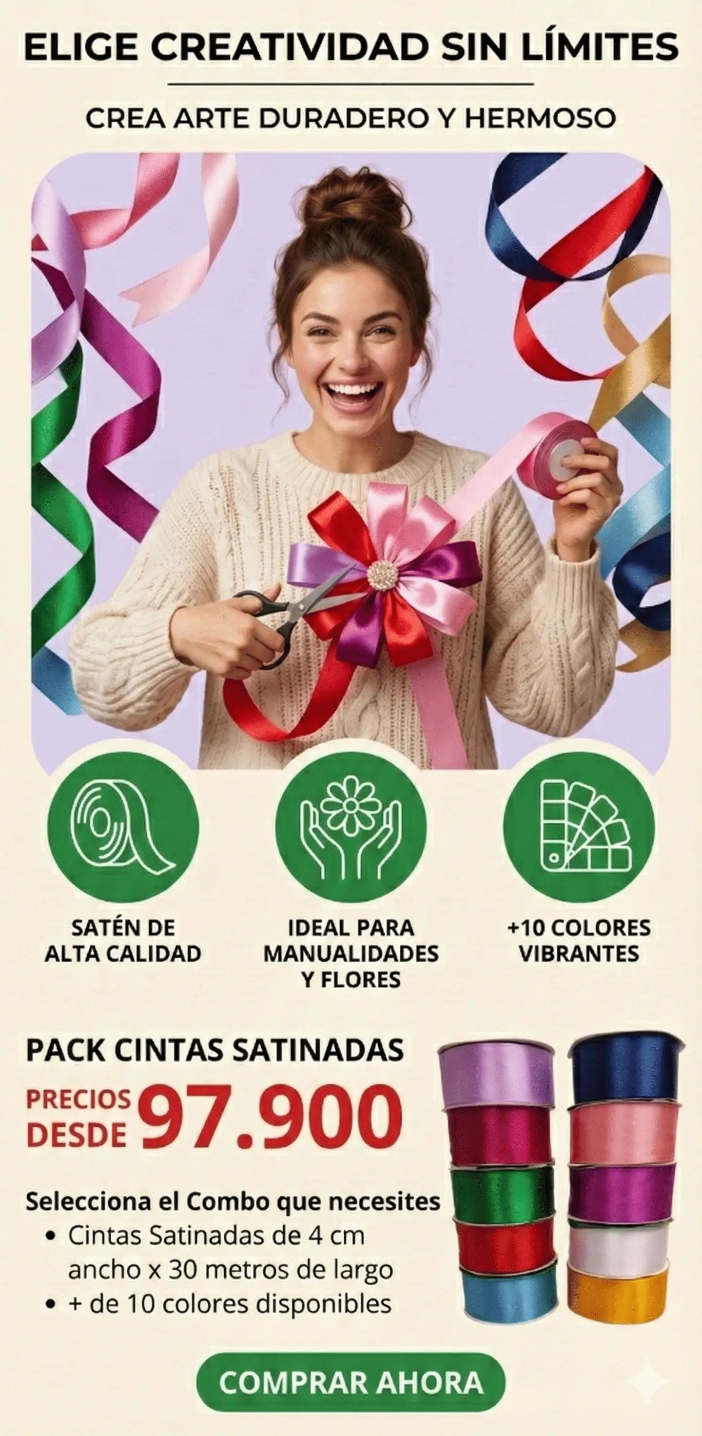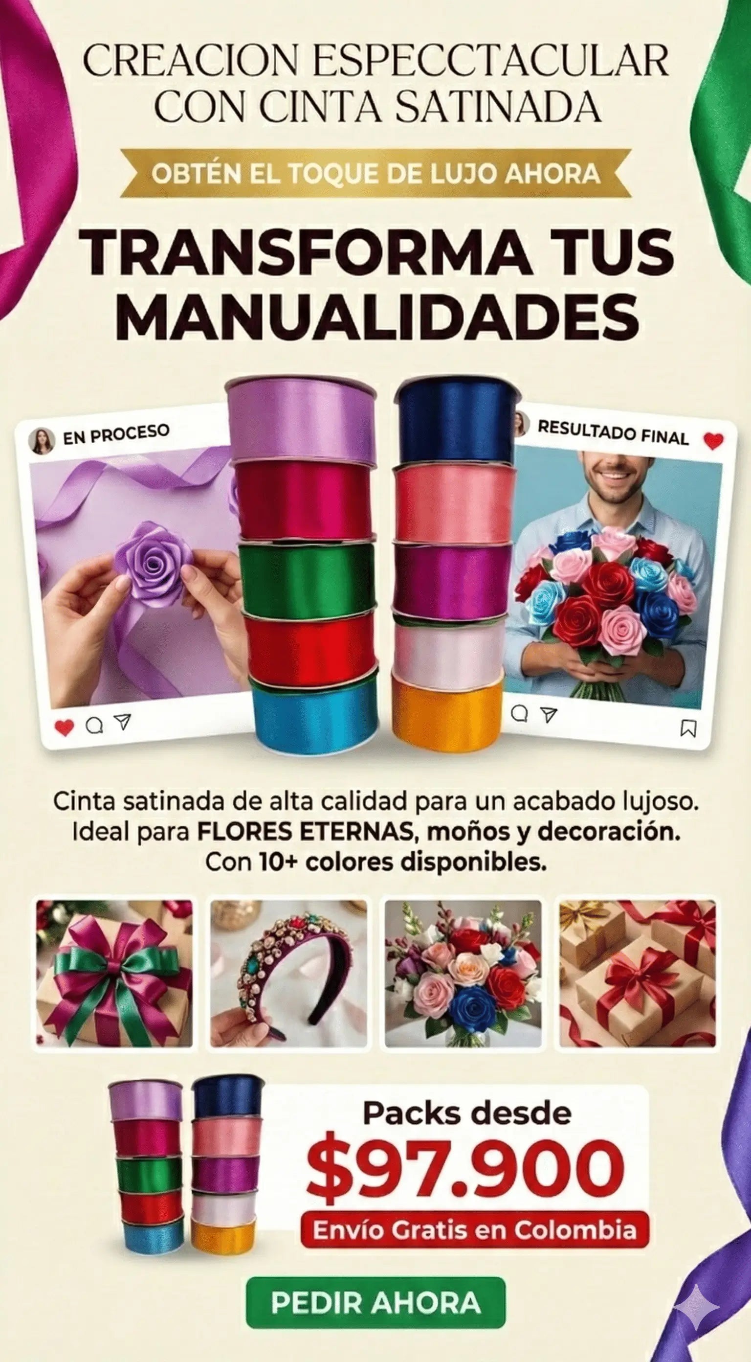 Tu compra incluye 6, 9 o 12 rollos de cinta satinada de 4cm x 30 metros, en los colores que seleccionaste.
